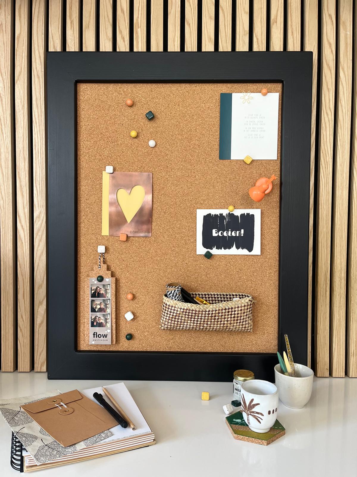 Dit stijlvolle prikbord met een matzwarte omlijsting en kurk prikgedeelte geeft een stoere en warme uitstraling aan je interieur.